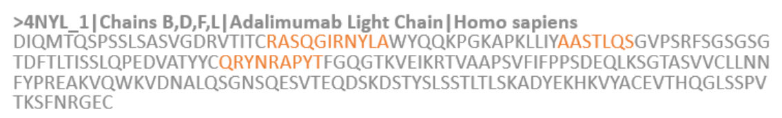 Complimentarity Determining Regions (CDRs) can be thought of as substrings of the overall sequence important to the functionality of the antibody. Here, highlighted in orange, you can see the CDRs on the light chain of the ABBVIE blockbuster drug Humira®.