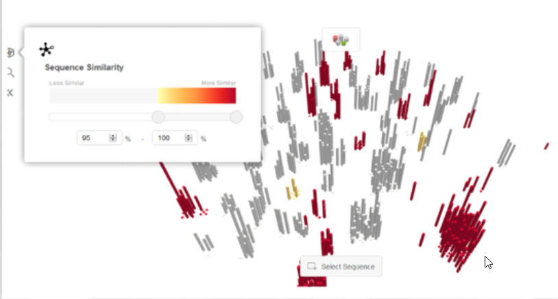 To show this in action, the similarity can be adjusted by selecting the uppermost icon on the left. In the example, the minimum similarity was adjusted to 95%. Doing something like this can be helpful to further focus on higher similarity sequences. Note the coloring is adjusted to the new range.